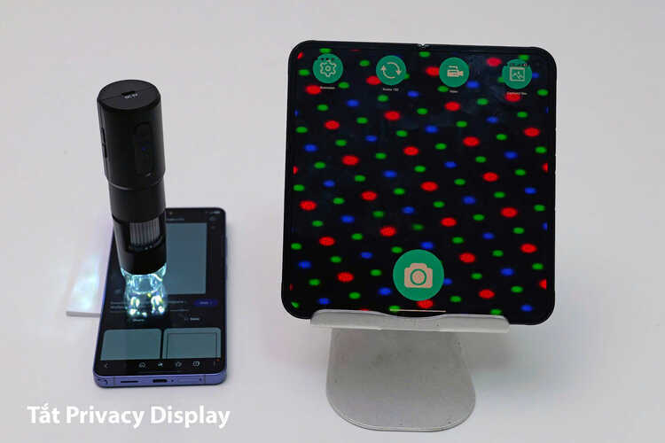 S\u1eed d\u1ee5ng m\u00e1y ch\u1ee5p hi\u1ec3n vi \u0111i\u1ec3m \u1ea3nh khi b\u1eadt, t\u1eaft Privacy Display tr\u00ean m\u00e0n h\u00ecnh S26 Ultra. \u1ea2nh: