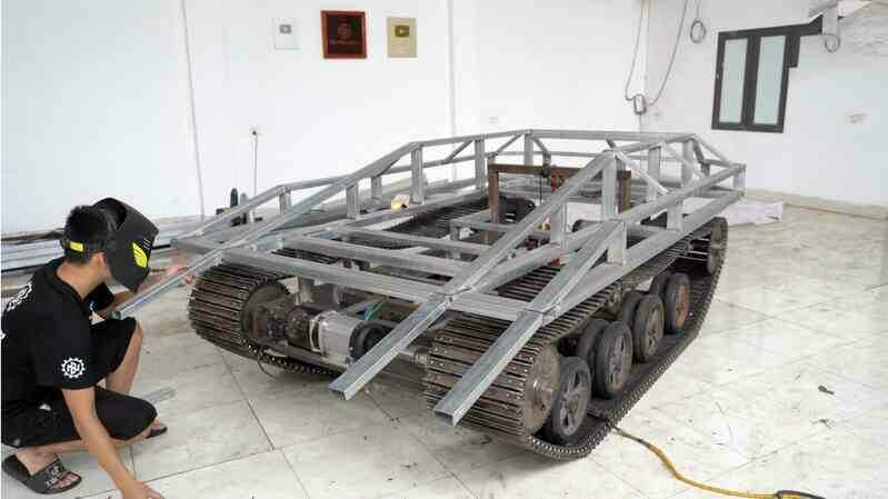 Bước đầu tiên để làm một chiếc xe tăng đến từ phần khung gầm. Dẫu vậy khác với những mẫu xe tăng trước đó anh Đạo Làm, phần khung gầm của chiếc xe mô phỏng STRV 103 được làm kỳ công và tốn nhiều nguyên vật liệu hơn cả.